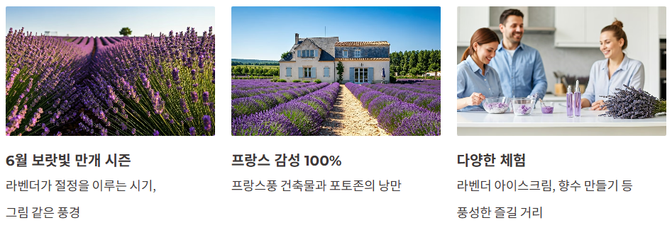 ✅ 프랑스 감성 100%: 라벤더밭뿐만 아니라 프랑스풍 건축물과 포토존 덕분에 여행의 낭만이 풍성해집니다.