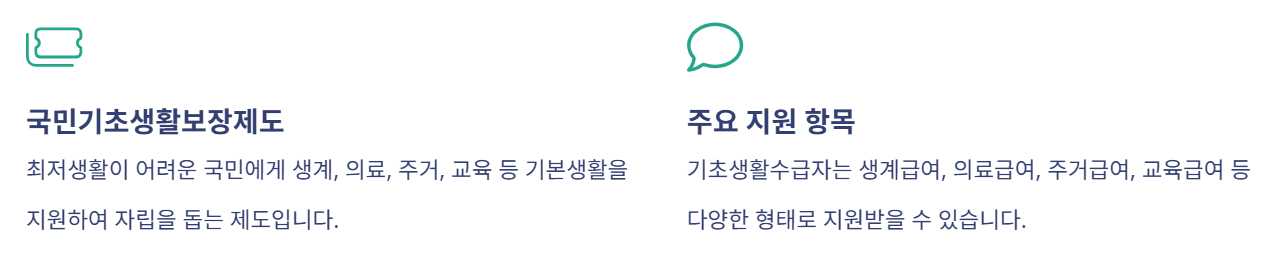- 정확한 소득·재산 심사로 선정되며, 생계급여, 의료급여, 주거급여, 교육급여 등 지원 항목이 다양합니다.