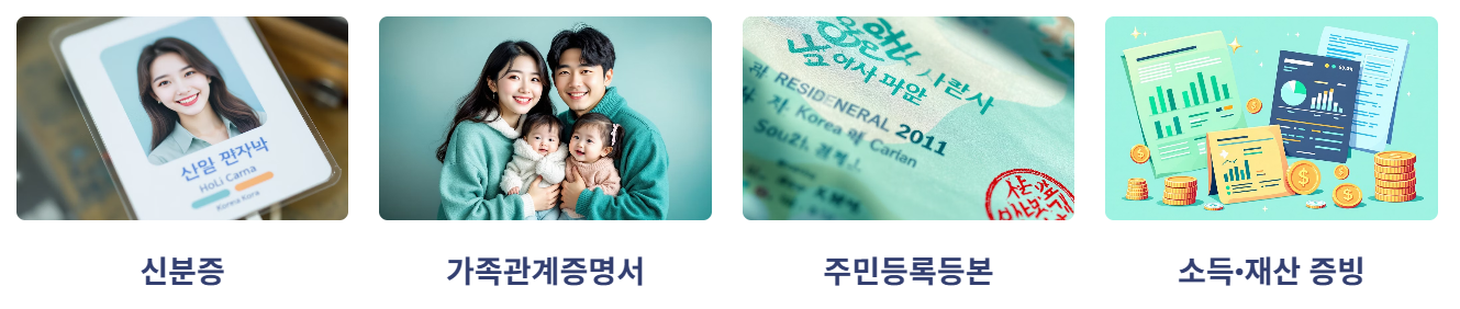 - 신분증, 가족관계증명서, 주민등록등본, 소득·재산 증빙 자료(통장, 근로소득증명 등)이 대표적입니다.
