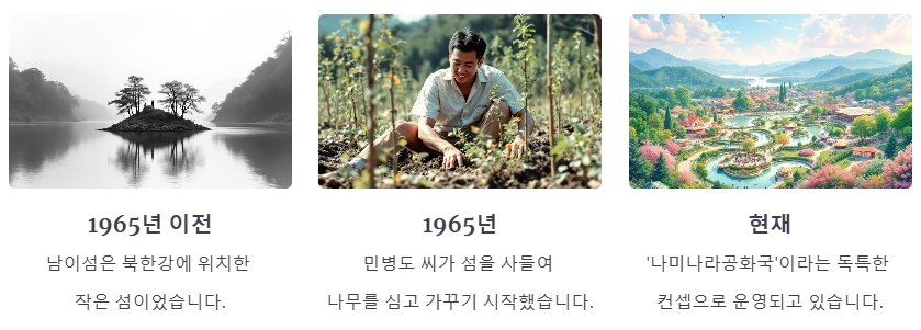 남이섬은 원래 북한강에 위치한 작은 섬이었지만, 1965년 민병도 씨가 섬을 사들여 나무를 심고 가꾸면서 현재의 아름다운 모습이 되었어요. 특히 '나미나라공화국'이라는 독특한 컨셉으로 운영되어 방문객들에게 특별한 경험을 선사합니다.