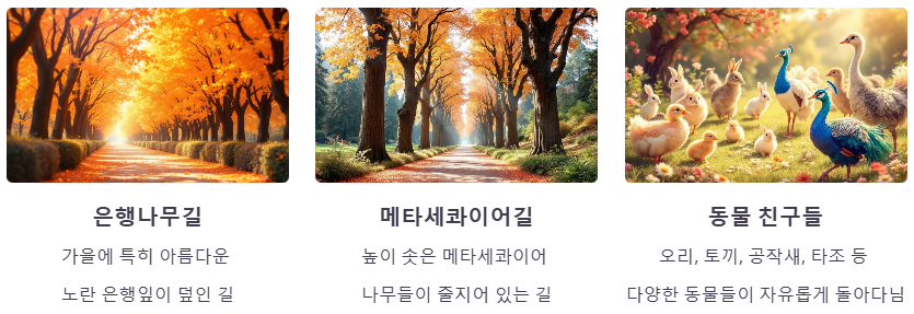 오리, 토끼, 공작새, 타조 등 다양한 동물들이 자유롭게 돌아다니고 있어 아이들과 함께 방문하기에 좋습니다.