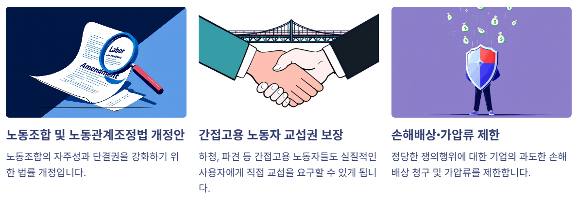 - 간접고용 노동자의 교섭권 보장, 쟁의행위(파업 등) 탄압 목적의 손해배상·가압류 금지가 주요 내용이에요.