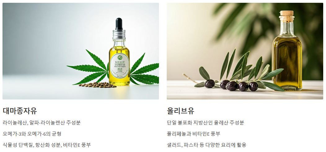 👉 대마종자유는 오메가-3·6이 풍부하고 항산화, 항염 효과가 뛰어나며, 올리브유는 올레산이 풍부해 노화 방지와 심혈관 건강에 도움을 줍니다.