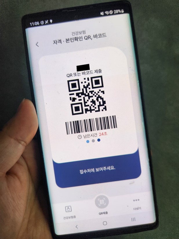 발급을 마쳤다면, 병원을 포함한 의료기관을 방문할 때 본인 확인을 위한 신분증으로 사용할 수 있습니다. 앱을 열고 하단의 'QR 제출'을 선택하면 생성된 QR 코드를 병원 접수처에 제시하면 됩니다.