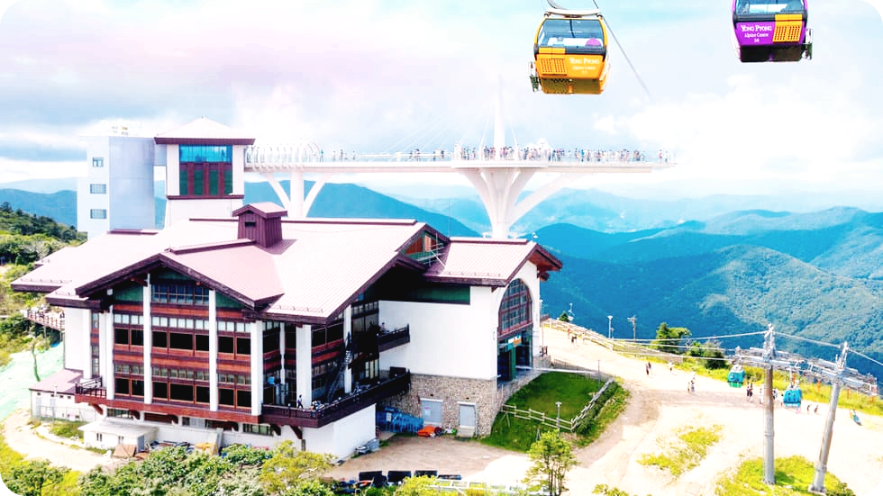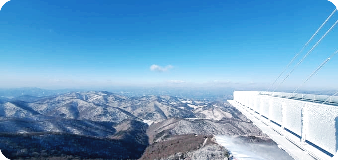 발왕산 정상에서는 대한민국에서 가장 높은 스카이워크를 경험할 수 있습니다. 1,458m 높이에서 내려다보는 경치는 정말 환상적입니다. 케이블카 요금에 스카이워크 이용이 포함되어 있어 추가 비용 없이도 이 멋진 경관을 즐길 수 있습니다.