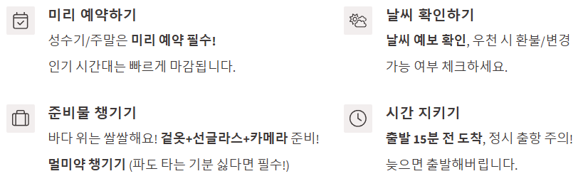 - 멀미약 챙기기 (파도 타는 기분 싫다면 필수!)
