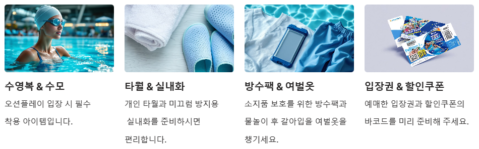 - 수영복, 수모(또는 모자), 타월, 실내화(미끄럼 방지용)