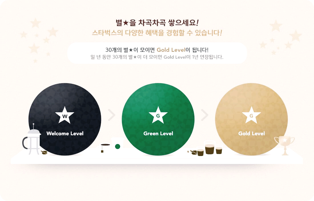 별 30개를 모으면 당신은 골드 등급! 이때부터는 혜택이 더욱 화려해집니다.