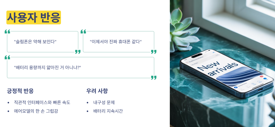 "슬림폰은 약해 보인다" vs "이제서야 진짜 휴대폰 같다" 궁금하신가요? 사실, 베타테스트 후기부터 얼리어답터들의 반응은 극과 극으로 갈립니다. 성능 올인 파는 AI 기능과 카메라의 발전에 엄지 척! 디자인 중시 파는 얇아진 두께 덕분에 호평이 쏟아집니다. 반면, “배터리 용량까지 얇아진 거 아니냐?” “내구성은 괜찮을까?” 같은 걱정도 존재합니다.