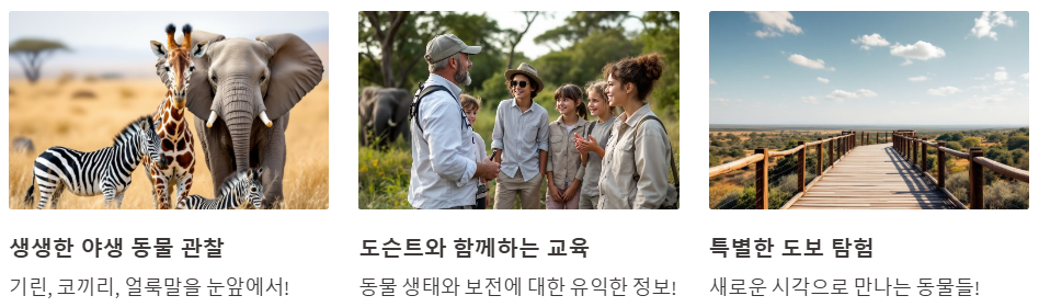 - 물 위 탐방로를 직접 걸으며 기린, 코끼리, 얼룩말, 홍학 등 다양한 야생 동물을 가까이에서 관찰할 수 있어요! (마치 다큐멘터리 속 주인공이 된 기분!)