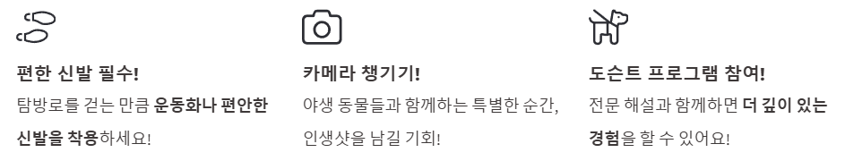 - 버스나 차가 아닌 도보 탐험을 통해 새로운 시각에서 동물들을 만나볼 수 있어요. (지금까지 경험해보지 못한 특별한 순간을 만끽하세요!)