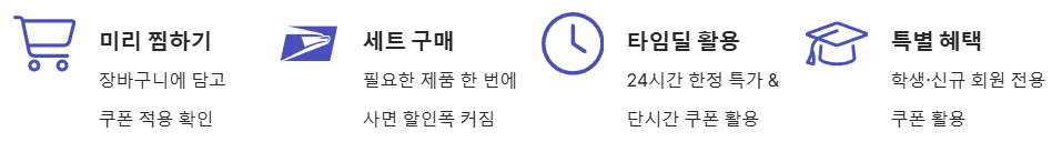 - 할인코드+쿠폰 중복 적용 불가 (매 구매마다 최적 쿠폰 선택 필요)