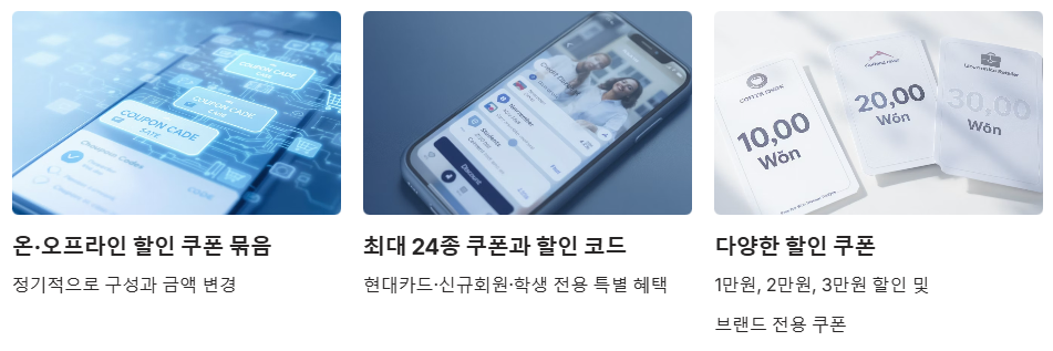 - 현대카드, 카카오페이 현대카드 등 제휴 카드 발급 시 추가 쿠폰 자동 지급