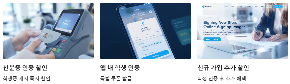 - 신규 가입 추가 할인: 학생 인증 후 신규 가입 시 추가 할인 혜택