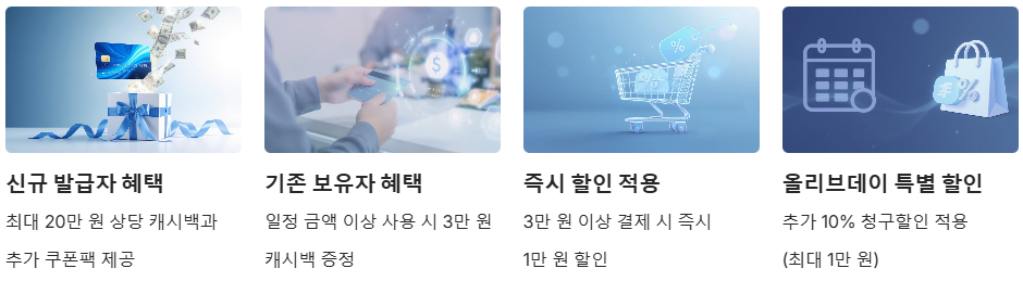 - 카드 신규 발급자는 최대 20만 원 상당의 캐시백 + 쿠폰팩