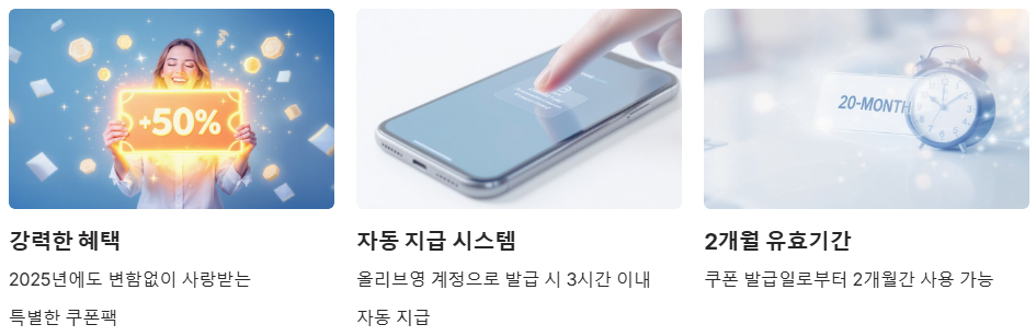✅ 쿠폰은 올리브영 계정으로 자동 지급되며, 발급 후 최대 3시간 이내에 계정에 들어옵니다.