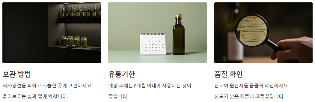 - 직사광선 피하고 서늘한 곳에 보관하기: 올리브유는 빛과 열에 약해 보관법이 가장 중요합니다.