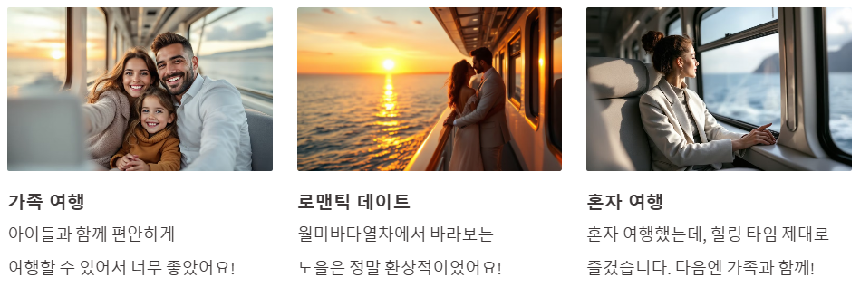 - "혼자 여행했는데, 힐링 타임 제대로 즐겼습니다. 다음엔 가족과 함께!"