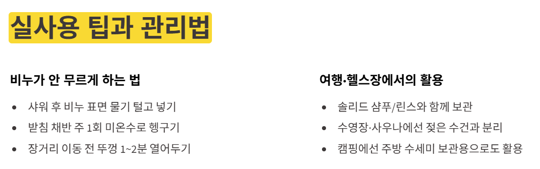 - 솔리드 샴푸·세안 비누도 함께 보관 시 두께 공간 고려.