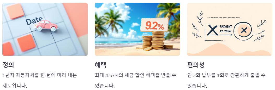 자동차세 연납은 매년 6월과 12월에 나눠서 내는 자동차세를 한 번에 미리 납부하면 할인 혜택을 받을 수 있는 제도입니다. 쉽게 말해, "미리 낼 테니 세금 좀 깎아주세요!" 하는 건데요.