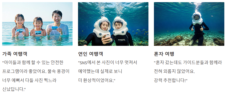 ✅ 후기 1 - 가족 여행객 : "아이들과 함께 할 수 있는 안전한 프로그램이라 좋았어요. 물속 풍경이 너무 예뻐서 다들 사진 찍느라 신났답니다. 직원분들이 친절하게 설명해 주셔서 안심하고 즐길 수 있었어요!"