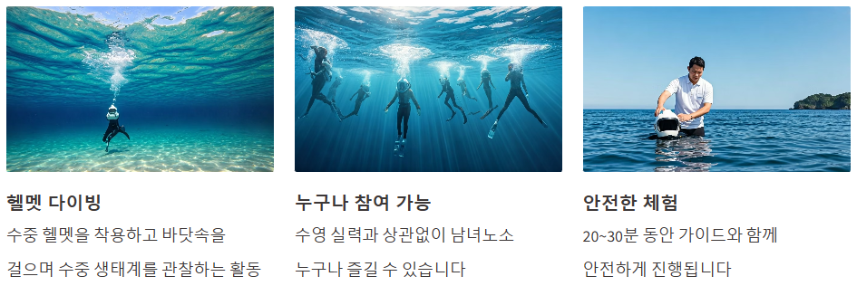 씨워킹은 수중 헬멧(Helmet Dive)을 착용하고 바닷속을 걸으며 수중 생태계를 관찰하는 해양 액티비티입니다.