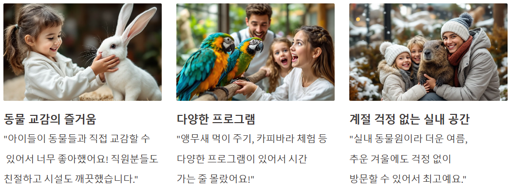 👉 "실내 동물원이라 더운 여름, 추운 겨울에도 걱정 없이 방문할 수 있어서 최고예요."