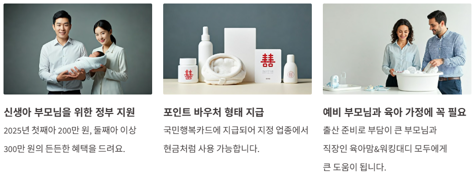 첫만남이용권은 신생아 부모님을 위한 든든한 정부 혜택입니다. 2025년에는 첫째아 200만 원, 둘째아 이상 300만 원이 지급됩니다. 이 금액은 육아를 시작하며 필요한 필수품을 살 때나, 병원비 등 다양한 곳에서 바로 사용할 수 있어 부담을 줄여줍니다. 기억하세요 이 금액은 '포인트 바우처' 형태로 국민행복카드에 지급됩니다. 현금처럼 쓸 수 있는 건 아니지만, 육아에 도움 되는 지정 업종에서 활용할 수 있습니다.