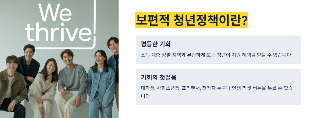 보편적 청년정책이란 누구나 차별 없이 받는 평등한 기회, 곧 소득·계층·성별·지역과 무관하게 지원 혜택이 찾아오는 시대를 의미합니다. 예전처럼 소득이 낮거나 취약계층이어야만 혜택을 받는 시대는 끝났습니다. 이제는 대한민국의 모든 청년이 '기회의 첫걸음'을 밟을 수 있습니다. 대학생이든 사회초년생이든, 프리랜서이든, 창작자이든 누구나 인생 리셋 버튼을 누를 수 있습니다.