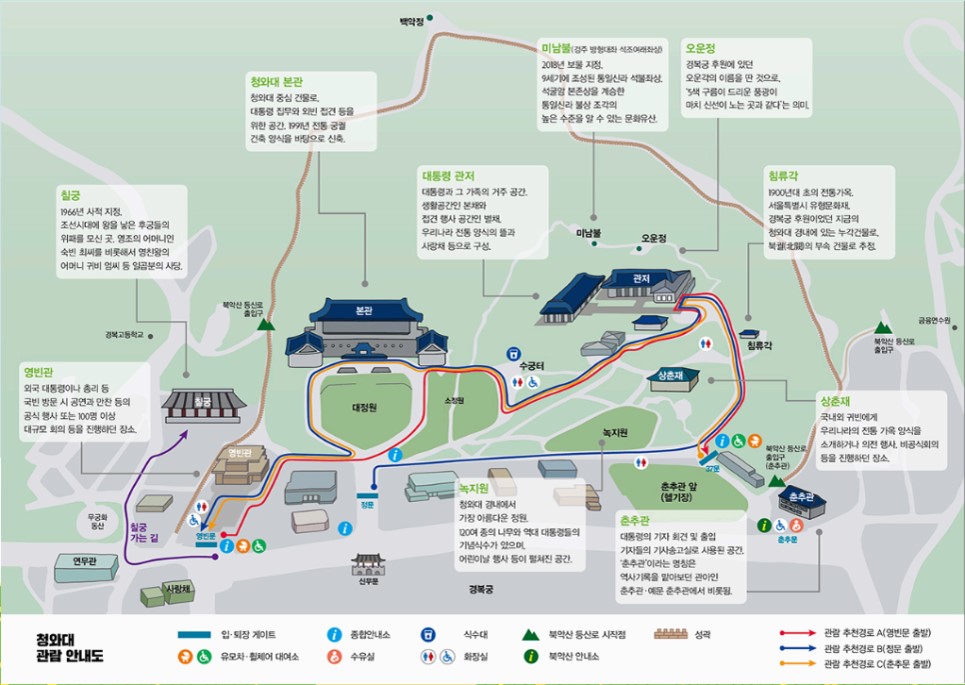 보통 춘추문에서 시작해 시계 반대 방향으로 관람하는 코스를 따르며, 관람해설 서비스를 이용하면 더욱 풍부한 정보를 얻으며 청와대를 둘러볼 수 있습니다.