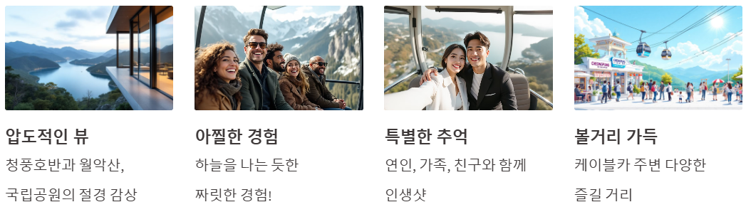청풍호반 케이블카는 단순한 이동 수단이 아니라, 청풍호반을 가장 멋지게 즐기는 방법! 사랑하는 사람과 함께 특별한 순간을 만들고 싶다면, 지금 바로 청풍호반 케이블카를 예약하세요! 😄