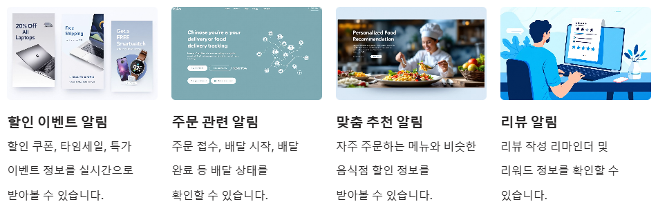 - 주문 관련 알림: 주문 접수, 배달 시작, 배달 완료 등