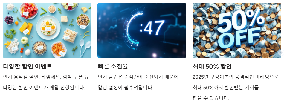 쿠팡이츠에서는 매일 다양한 할인 이벤트가 진행되고 있습니다. 특히 인기 음식점 할인, 타임세일, 깜짝 쿠폰 등은 순식간에 소진되기 때문에 알림 설정이 되어 있지 않으면 놓치기 쉬워요. 2025년 기준으로 쿠팡이츠는 더욱 공격적인 마케팅을 펼치며 다양한 할인 혜택을 제공하고 있기 때문에, 알림 기능을 잘 활용하면 최대 50%까지 할인받는 기회를 잡을 수 있습니다!