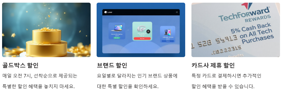 - 골드박스 할인: 매일 오전 7시 선착순 특가