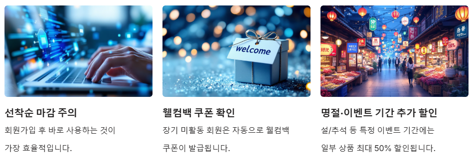 - 첫 구매 쿠폰은 조기 소진 가능성이 높기 때문에, 회원가입 후 바로 사용이 가장 효율적입니다.