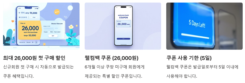 - 웰컴백 회원: 약 6개월 간 미구매 시, 동일한 수준(최대 26,000원)의 웰컴백 쿠폰 발급(5일 이내 사용 가능)