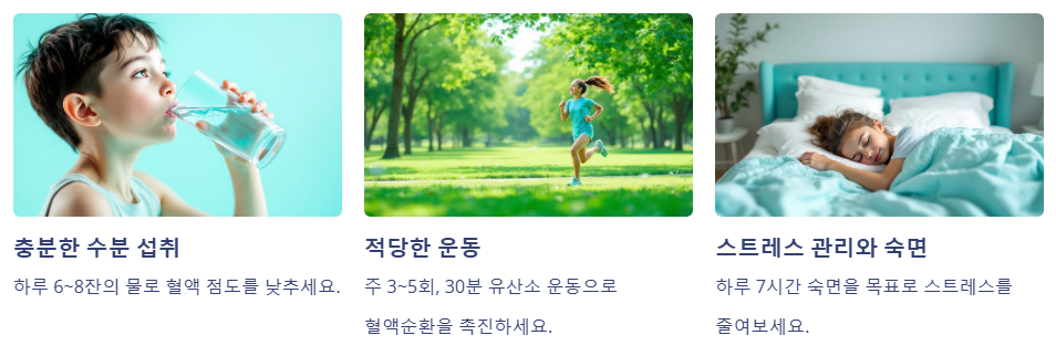 - 잠이 부족하면 혈액순환이 느려지니, 하루 7시간 숙면을 목표로 하세요.