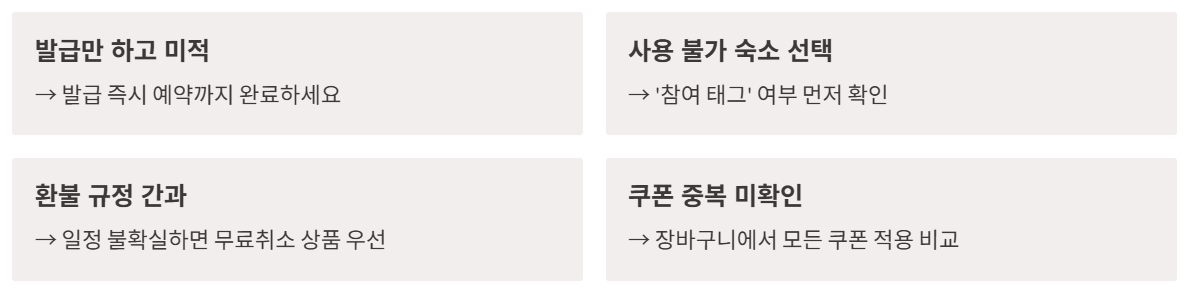 • 환불 규정 간과: 비환불 조건으로 싸다고 결제. → 일정 불확실하면 무료취소 가능 상품 우선.