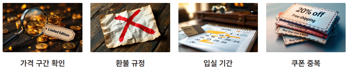 3. 관심 숙소 찜·장바구니 담기: 발급 직후엔 트래픽이 몰립니다. 미리 담아두면 쿠폰 적용만 누르면 끝. 체크인/체크아웃 날짜도 사전 확정.