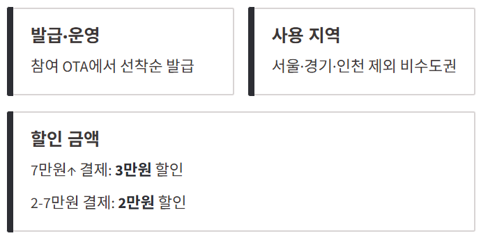 • 발급·운영: 참여 OTA(예: G마켓 여행, 주요 국내 OTA)에서 선착순 발급