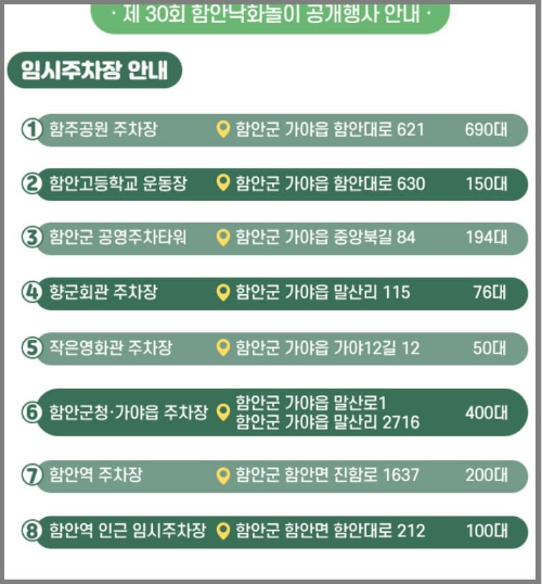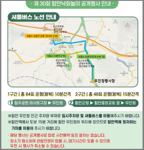 2023년 기준 셔틀버스 운행 정보이며, 2024년에도 임시주차장에서 행사장까지는 셔틀버스가 운행될 예정입니다. 셔틀버스의 정확한 일정과 노선은 향후 함안군 홈페이지 및 SNS를 통해 별도로 공지될 예정입니다.