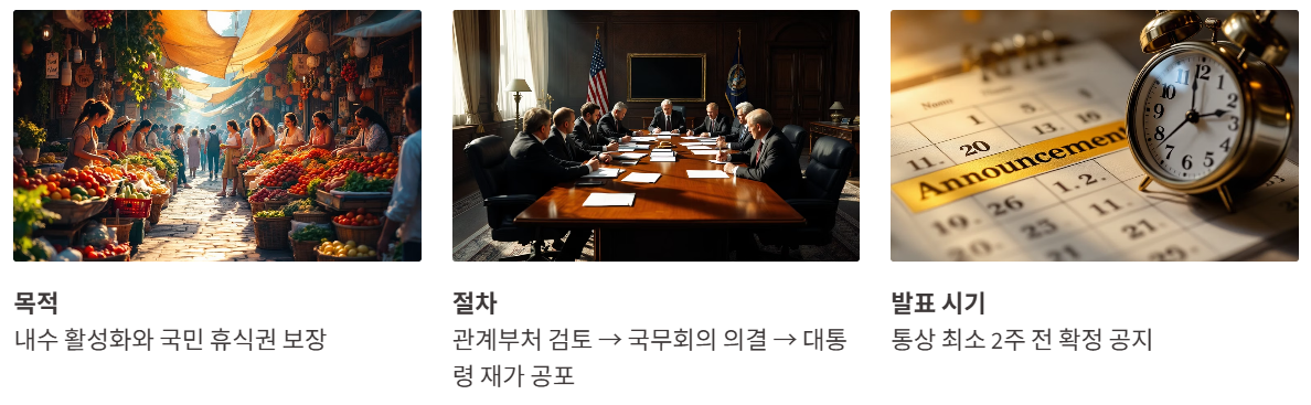 • 절차: 관계부처 검토→국무회의 의결→대통령 재가 공포. 통상 최소 2주 전에는 확정 공지되는 흐름.