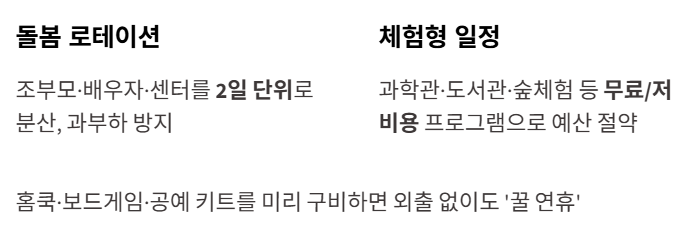 • 체험형 일정: 과학관·도서관·숲체험 등 무료/저비용 프로그램으로 예산 절약.