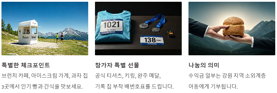 빵트레일런은 단순한 러닝 이벤트가 아닙니다. '빵빵런'의 취지를 이어받아 수익금 일부를 강원 지역 소외계층 아동에게 기부할 예정이에요. 여러분의 참가가 의미 있는 사회 공헌으로 이어진다는 점, 정말 특별하지 않나요?